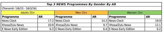 The above table definitely blows popular perceptions out of the water. Women show higher AR’s than Men when it comes to the News! The Xhosa and Zulu News bulletin are the preference for both sexes.