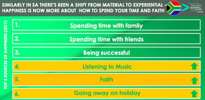 Our priorities have also changed, Dias points out. There’s a move away from rampant materialism to having experiences. “Happiness is about time and how you spend it,” she says. “There’s a shift from superficial markers to deeper connections.” Our family and friends are vitally important. But while the world has pushed down being successful to positions five and six, in South Africa, with our particular socio economic situation, being successful is the third most important thing.