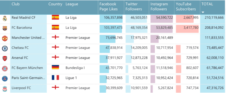 Individual players also have colossal followings. Cristiano Ronaldo, for example, has 122m likes on Facebook which is more than double the combined populations of Spain and Portugal. KPMG Football Benchmark, a company which tracks the combined official social media accounts of football clubs across a range of social media channels, has collated some impressive figures on the world’s most followed clubs.
