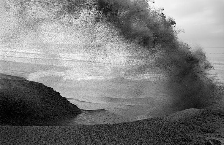 Much of this work is portentous, ominous, pointing towards the unknown at the threshold of elements, be it water, earth, air or fire. But some photographs present the landscape as completely unfixed, where centrifugal forces have turned things completely upside down. In the photographs of the replacement of sand on Durban’s South Beach (2007), the flying gobs look like some planetary constellation or biblical plague and the ground is framed as flying in bits through the sky.