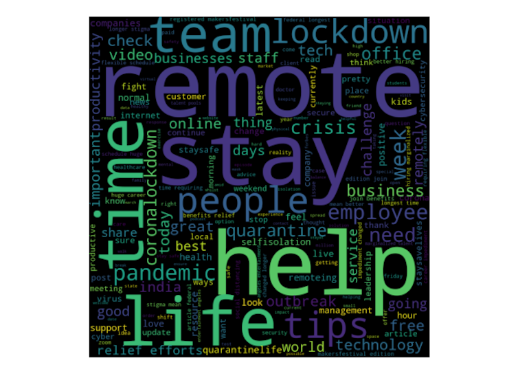 Generating a word-cloud to observe the frequency of the words appearing in the tweets during this period, we also found the overall sentiment of the social media response to #WFH to be positive. There is a clear sense of productivity, with words such as “team”, “tips”, “satisfaction”, “service”, “remote”, “support” and “good” among the most prominent.