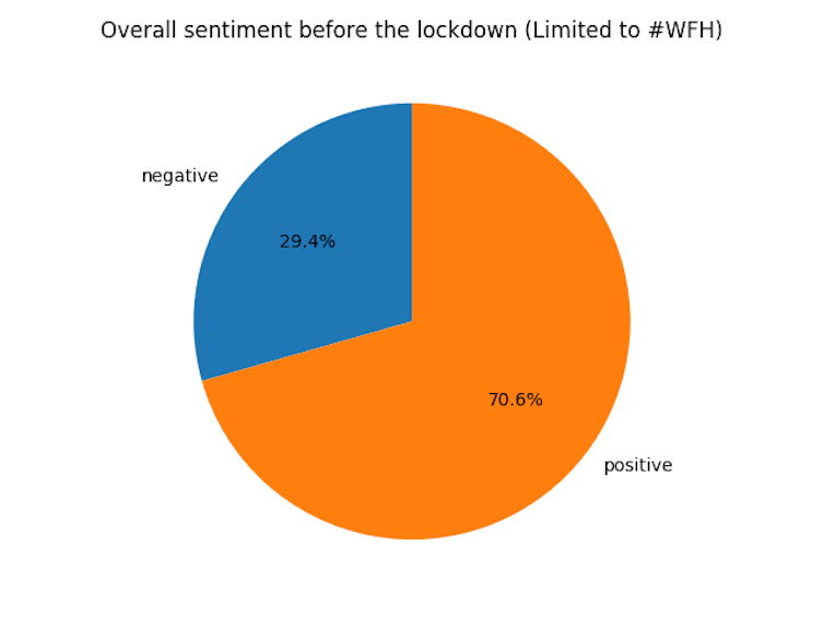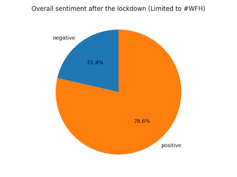 The idea was to assess how people were feeling about working from home. Overall, we found that 70.6% of the tweets reflected a positive sentiment towards the idea. The tweets that came from UK users after the lockdown on March 23 saw a rise in the positive feedback sentiment to 78.6%.