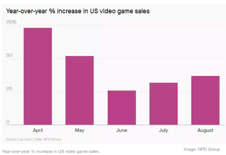 Gaming sales in the US in August increased 37% year-over-year to $3.3 billion, according to the market research firm NPD Group. That’s the fifth straight month of huge jumps in sales compared to the same periods in 2019.