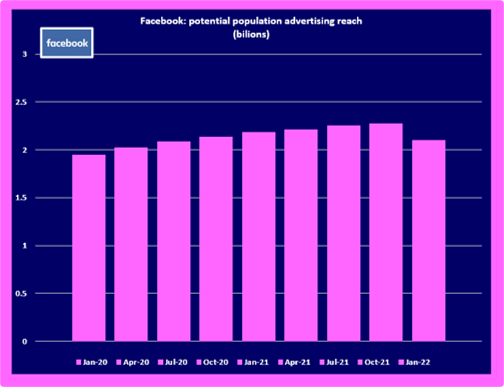 Facebook always reports user numbers in two metrics: daily active users (DAU) and monthly active users (MAU). These labels mean exactly what they say: DAU indicates the number of people who use Facebook at least once a day; MAU indicates the number of people who use Facebook at least once a month. Of course Facebook prefers to trumpet the latter, as the difference in these two numbers is significant: 1.929 billion (DAU) vs 2.912 (MAU) billion in 2021Q4.