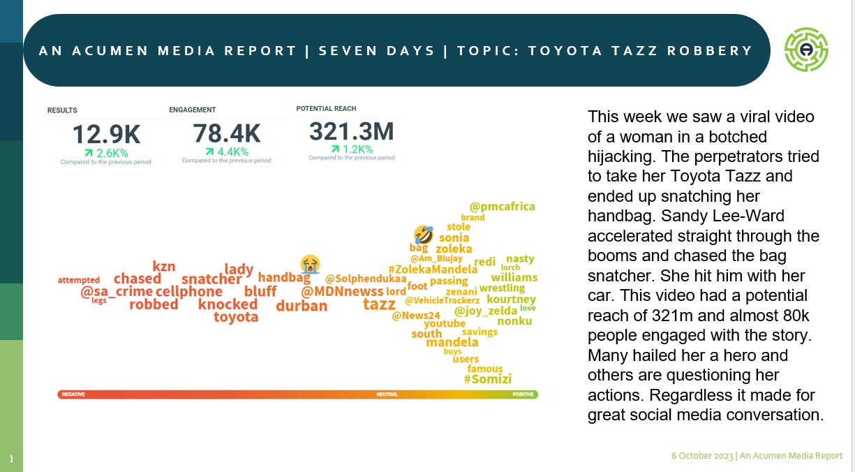 Sandy is the woman in the #ToyotaTazz that decided she’d give two hijackers a run for her handbag. Sands went to the bank to get a letter of confirmation. Now we’ve all been there, those letters are a right pain in the proverbial.