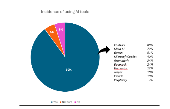 Results show a near-ubiquitous adoption of AI tools among the respondents, with 90% using AI tools.