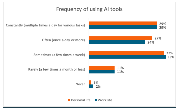 AI tools are used frequently in both work and personal contexts. Fifty-six percent and fifty-three percent respectively use AI at least once a day for personal and work-related tasks.