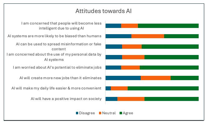 - Risk and bias: There is a significant level of concern regarding the ethical and practical risks of AI. A large majority of 61% agree that ‘AI can be used to spread misinformation or fake content’, and 58% are concerned about the use of their personal data. Furthermore, 37% agree that ‘AI systems are more likely to be biased than humans’, with a substantial 35% remaining neutral on the topic.