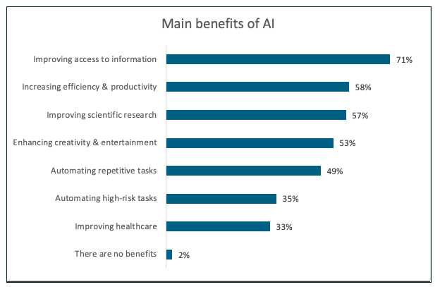 Consumers most value AI for its ability to streamline processes and make information more readily available, but have lower confidence in it being involved in high-risk tasks or improving healthcare.