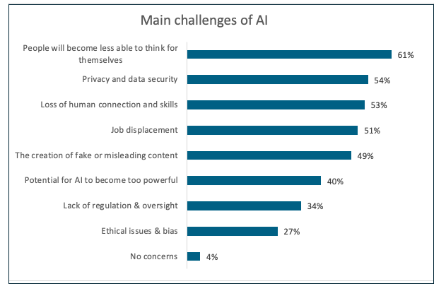 Consumers’ primary concerns regarding AI are centred on its potential impact on human cognitive abilities, privacy, and social skills. The top-ranked concern, held by 61% of respondents, is that ‘people will become less able to think for themselves’.