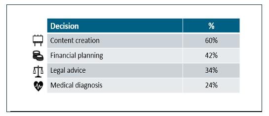 Consumers are most comfortable with AI making decisions related to creative and less critical tasks, while there is a significant lack of trust for high-stakes, professional decisions. 60% are comfortable with AI making decisions about content creation, while only 24% are comfortable with medical diagnoses. This clearly indicates that AI is viewed as a tool for creative assistance and support, but significantly less so as a reliable substitute for human expertise in fields requiring critical judgment and personal responsibility.