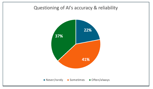 The majority of users do not consistently trust AI’s accuracy and reliability. A combined 78% of respondents ‘sometimes’, ‘often’, or ‘always’ question the accuracy of AI. This shows that while people are widely using AI, they are not blindly accepting its output. Instead, a significant portion of users remain sceptical and actively verify the information provided by these tools.