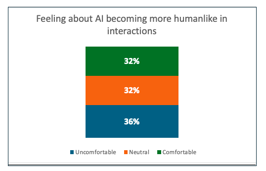 There is no consensus on how people feel about AI becoming more human-like in its interactions with opinions split. This suggests that the public has not yet formed a clear opinion on the long-term goal of making AI more conversational and emotionally intelligent, indicating a mix of curiosity, apprehension, and indifference.