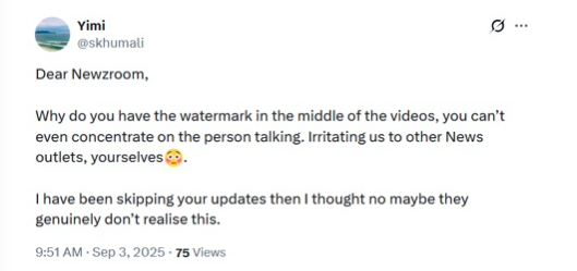 Newzroom Afrika’s response – applying large, distracting watermarks – has been a direct reaction to content thieves cropping out the smaller, standard station logos. However, this has inadvertently impacted the legitimate online viewing experience.