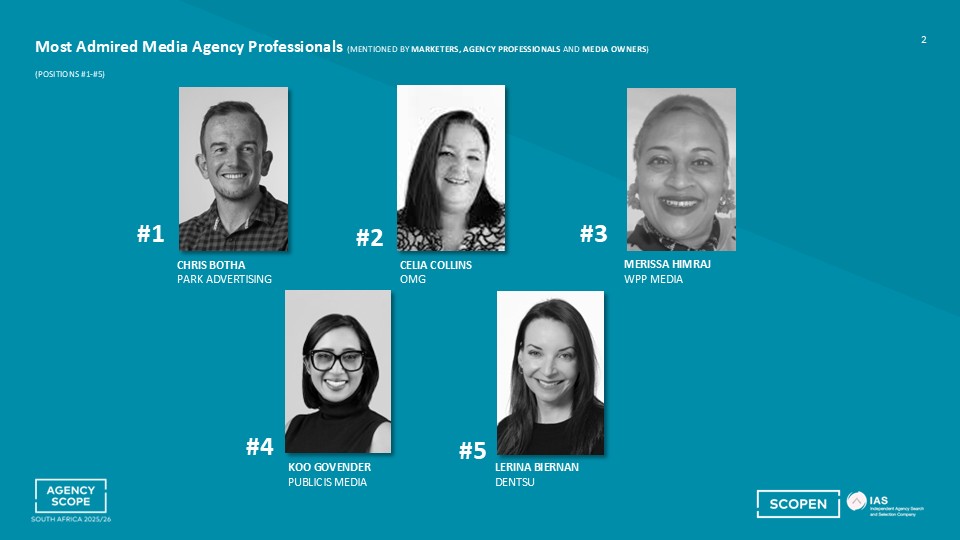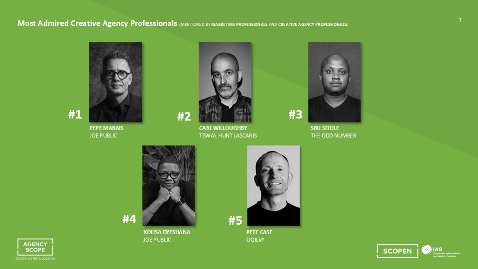 SCOPEN has unveiled South Africa’s most admired creative and media agency professionals for 2025, based on spontaneous nominations from both marketers and agency peers.