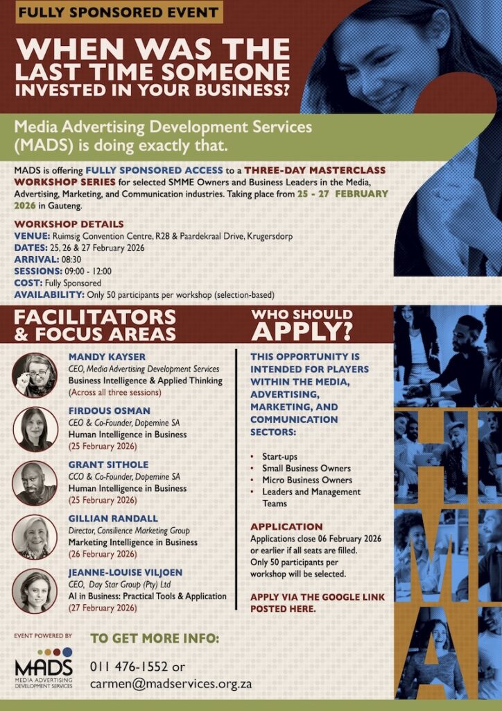 There is immense talent in South Africa, particularly at community and grassroots level, but access to practical knowledge, networks and real-world (media) industry insight  is uneven. That’s the word from Mandy Kayser, executive director of Media Advertising Developing Services, or MADS.