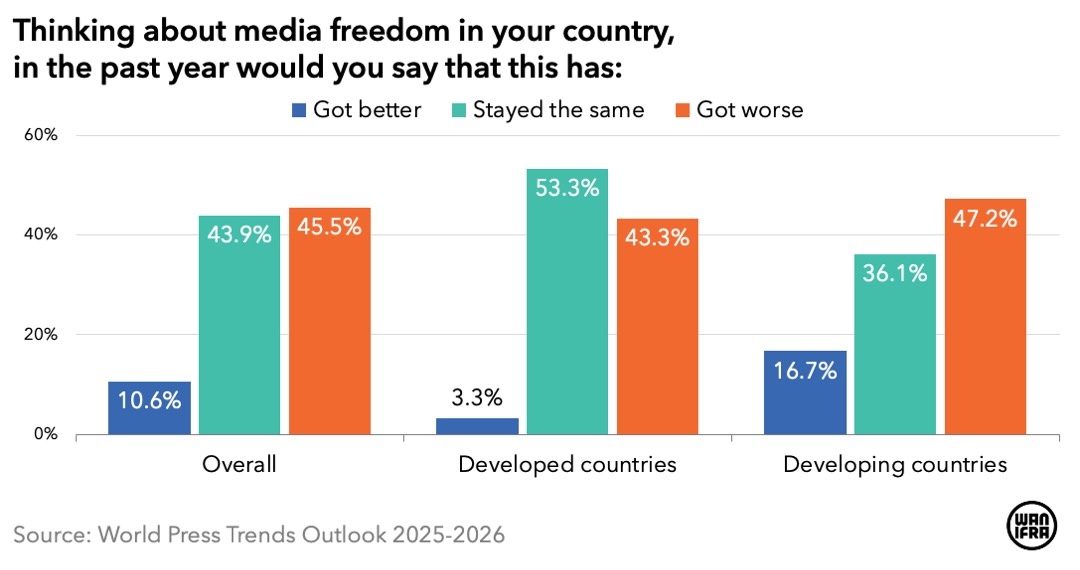 Almost half (45.5%) of those surveyed said that media freedom had worsened in their country over the past year. Just over one in ten (10.6%) reported improvements in this area.