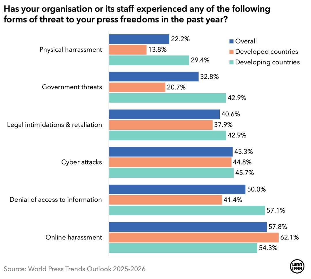It’s bleak: Attacks against journalists are increasing in scope and variety – and while physical harassment, threats, retaliation and lawfare by authorities are increasing, it is the online space, where cyberattacks (45.3%) and harassment (57.8%) loom large for newsrooms and journalists.