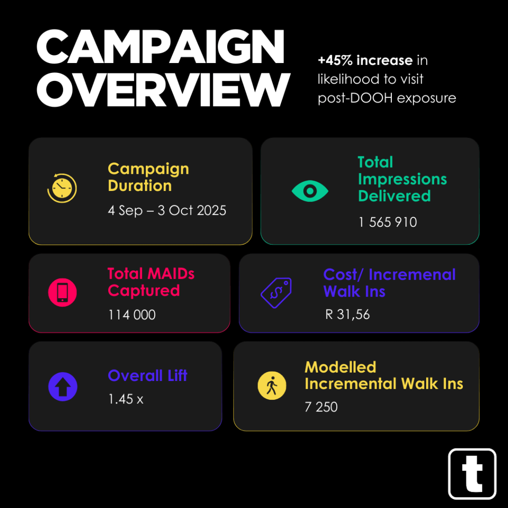 What’s also interesting to note is that context did much of the heavy lifting, and not necessarily size. The strongest results came from specific malls and retail corridors where people were already in a buying mindset, showing that DOOH can influence people who are ready to shop.